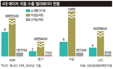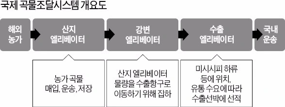 곡물거래에 있어 중요한 역할을 하는 것은 생산자와 소비자를 세계적 규모로 연결시키는 일련의 산업활동입니다. 이를 과점으로 수행하는 기업은 소위 곡물 메이저로 불리고 있는 대규모 곡물 유통업자들입니다. 국제적으로 곡물 수출경쟁력의 우위성은 기업의 곡물 처리 및 선적 능력이 중요한 지표가 됩니다. 여기에서 주목할 단어는 '곡물 엘리베이터'라는 생경한 용어입니다.
