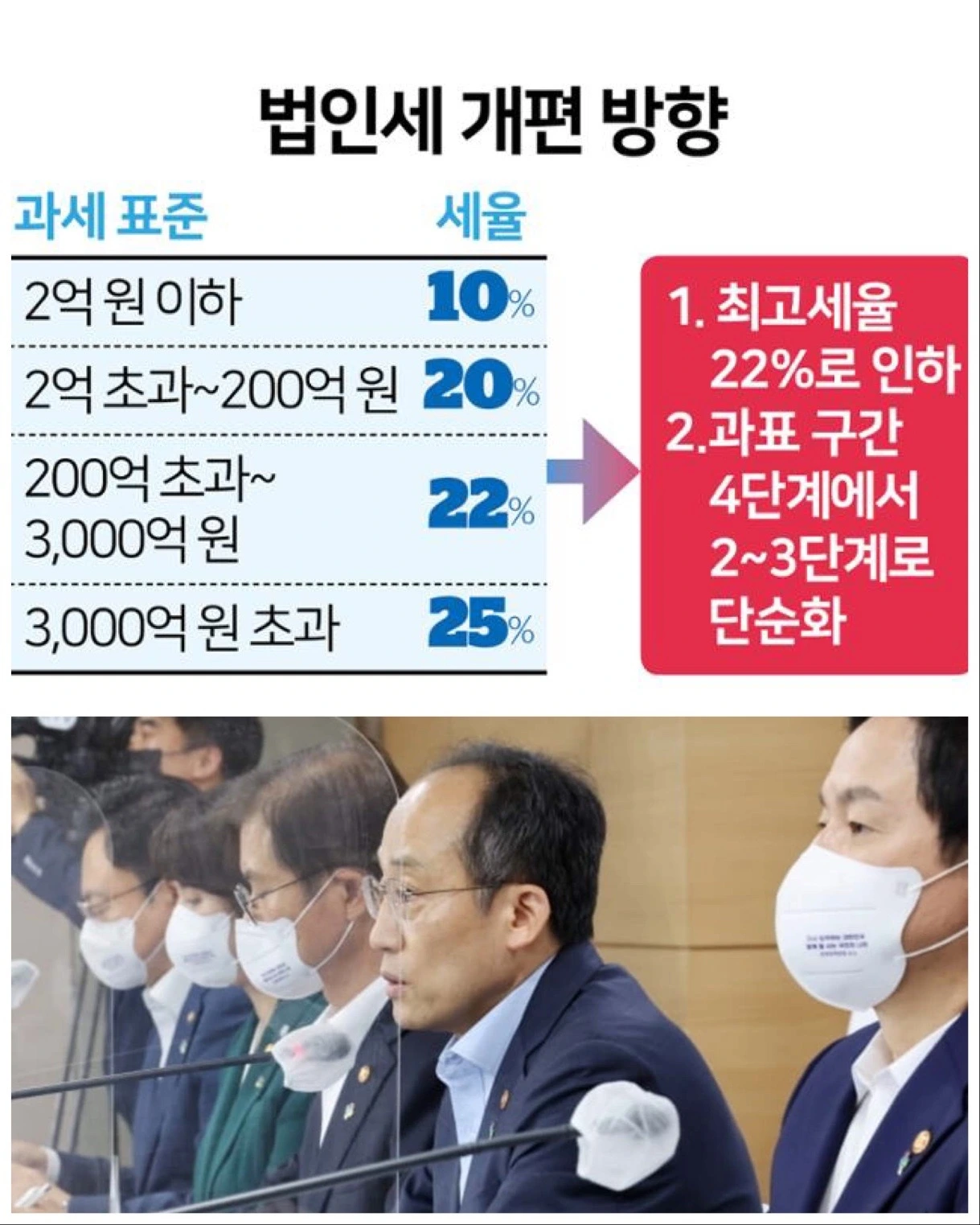 법인은 법적 '인격체'라는 의미에서 개인의 소득세와 별반 다르지 않습니다. 법인세는 다른 말로 '법인 소득세'라고 합니다. 기업이나 영리 단체가 벌어들인 이윤에 부과하는 세금이라는 것이지요. 개인과 다른 점은 외부 지출 금액이 장부에 잘 드러나기에, 외부 유출금 즉 지출을 제외하고 남은 '이익금'에 일정 비율 부과합니다. 이번 개정으로 이득의 최고구간 22%를 부과합니다. 개인 소득세는 구간별 차등이 있기에 직접 비교는 어렵지만, 8~45%의 부과되는 소득세율의 평균은 22%에 가깝게 느껴집니다. 제법 일리가 있어 보입니다.