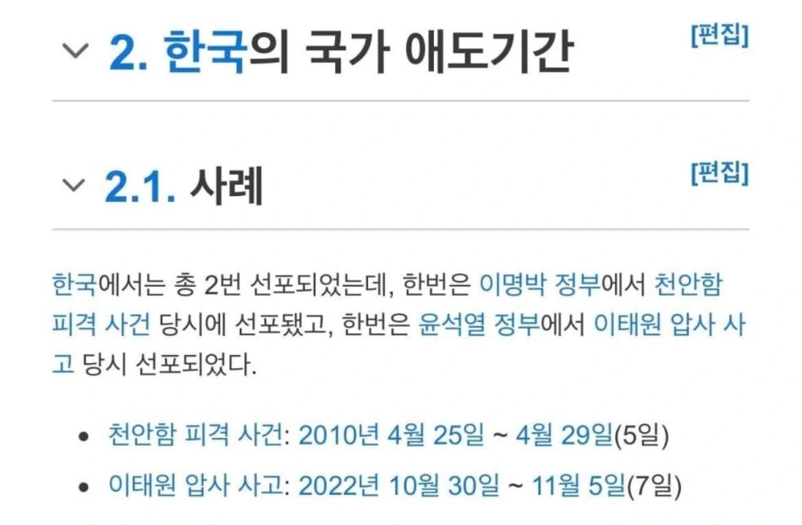 정부는 손빠르게 '국가 애도 기간'을 선포했습니다. 그런데 아시나요? 전국민을 허망하게 만든 사건 '세월호 참사'의 경우 국가 애도 기간이 없었습니다. 이번 사건이전 딱 한번의 전례가 있었는데, '천안함 피격 사건(2010.3.16)'입니다. 그런데 애도 기간은 사건이 발생한 후 한달 뒤였습니다.