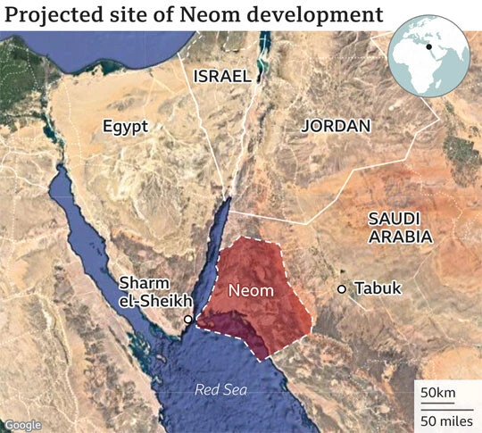 ‘네옴 시티’는 석유, 석탄 에너지 의존도를 줄이고 경제, 산업 근조를 다각화하려는 ‘사우디 비전 2030’ 프로젝트의 일환입니다. 사우디 북부 타부크 일대에 건설될 미래형 스마트 도시인 ‘네옴 시티’는 면적은 서울의 44배가량인 약 2만 6500㎢로 벨기에와 맞먹는 크기입니다. 이름에서부터 '미래형 신도시'의 의미를 짐작할 수도 있습니다. ‘네옴’은 ‘새로운(New)’을 뜻하는 고대 그리스어 ‘네오(Neo)’와 ’ 미래’를 뜻하는 아랍어 ‘무스타크발(Mustaqbal)’의 M을 합친 것이지요.