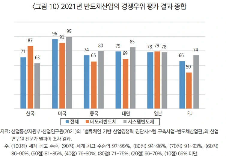 위의 보고서를 보면, 반도체 산업의 종합경쟁력은 미국이 1등, 한국의 종합경쟁력은 시스템반도체가 최하위 수준이다. 미국은 시스템반도체(99), 메모리 반도체(91) 등 모든 제품에서 최상위다. 대만은 메모리 반도체(69)는 열위이나 시스템반도체(85)에서 높은 경쟁력을 보유하고 있다. 한국은 대만과 정반대이다. 메모리 반도체(87)에서는 높은 경쟁력을 평가받고 있으나, 시스템반도체(63)가 비교 대상국 중 최하위다. 이것이 이유가 되어 종합평가에서도 하위권으로 평가된다.(괄호 안 점수는 연구보고서의 정량 점수 환산 100점 만점)