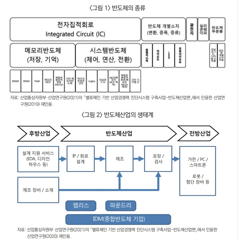 반도체는 전자기기에서 연산, 제어, 전송, 변환, 저장 등 첨단 서비스를 수행하는 핵심부품이며, 반도체 산업은 이를 생산하는 제조업을 중심으로 후방산업인 제조 장비, 소재산업을 포함한다. 반도체 산업의 가치사슬별 경쟁우위를 정성적·정략적 지표로 진단한 결과, 미국은 반도체 종주국으로 여전히 세계 반도체 시장 점유율 1위로 R&D/설계 분야에서 최고의 경쟁력을 가지고 있으나, 제조 분야는 대만과 한국의 경쟁력이 더 높게 나타났다. 종합경쟁력 비교에서 한국은 비교 대상국인 미국, 일본, 대만 등 주요 6개국 중에서 5위를 차지하였다. 메모리 반도체를 제외하고는 나머지 분야에서 모두 경쟁열위에 있기 때문이다.
