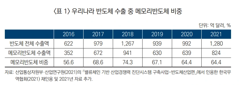 부가가치는 제조(팹리스, 설계 등)가 칩(Chip) 생산(메모리, 비메모리) 보다 월등히 높으며, 생산물 중에서는 시스템 반도체가 메모리 반도체보다 상당한 정도로 높다. 대한민국은 칩 생산, 그중에서 메모리 반도체가 전체의 64% 이상 차지하고 있다. 냉정하게 '고부가가치의 가치사슬'은 형성하지 못하고 있다. 가장 큰 약점 중의 하나이다.