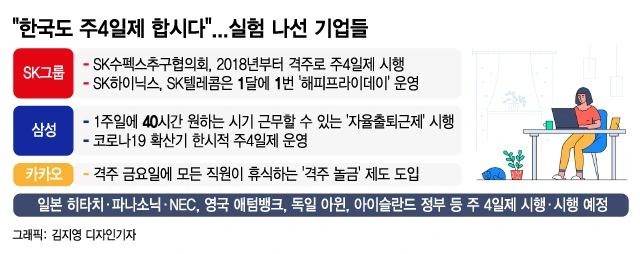 그리고, 노동 시간 주 4일제를 성공했다는 한국의 기업들은 '스타트업'이나 '플랫폼 기업'들이 대부분이다. 이들의 근무 형태와 환경을 생각해 보자. 소위 '근태관리'라는 것이 타이트할까? 출근부를 작성하고 휴식 시간과 퇴근을 기록하는 생산직과 같을까? 이들은 코로나 팬데믹을 겪으며 '재택근무'라는 리모트 오피스에 익숙한 기업들 아닌가? 회사에 나오든 말든 성과를 이루면 되는 조직으로 그 근무형태를 자랑하는 기업 아니었던가.