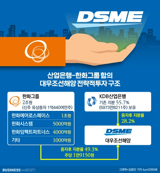 이번에 기업결합을 신고한 한화그룹은 지난 16일 대우조선 인수를 위한 2조 원 규모의 유상증자에 참여하는 내용의 신주인수계약(본계약)을 체결했다. 유상증자에는 한화에어로스페이스(1조 원), 한화시스템(5000억 원), 한화임팩트파트너스(4000억 원), 한화에너지 자회사 3곳(1000억 원)이 각각 참여한다. 인수가 마무리되면 대우조선 지분 49.3%를 확보해 최대주주가 된다. 산업은행 지분은 28.2%(2대 주주)로 낮아진다. -기사 본문 중-