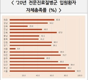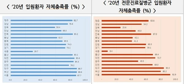 2020년 기준 환자가 거주하는 지역에서 입원진료를 받은 비율을 나타내는 자체충족률은 대구가 88.7%로 가장 높음. 그 외 자체충족률이 80% 이상인 지역은 서울, 부산, 광주, 대전, 울산, 전북, 제주였고, 세종은 29.7%로 가장 낮은 수준.