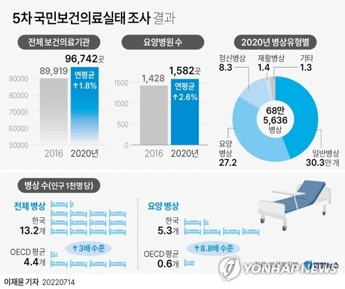 우리나라의 인구당 병상 수, 자기 공명영상장치(MRI) 수, 입원 일수 등이 모두 경제협력개발기구(OECD) 평균보다 많은 것으로 나타났다. 특히 요양병원이 크게 늘면서 요양병상 수는 OECD 평균 대비 8.8배로 나타났다. -기사 본문 중-