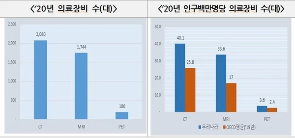 인구 100만 명당 장비 수는 2020년 기준 CT 40.1대, MRI 33.6대, PET 3.6대로 2019년 기준 OECD 평균 CT 25.8대, MRI 17.0대, PET 2.4대와 비교했을 때 보유량이 많은 편. (의료 원가의 대부분이 인건비와 정비비라는 고정비임을 기억하자)
