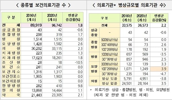 2020년 보건의료기관 수는 총 9만 6742개소이며, 2016년부터 2020년까지 연평균 1.8%씩 증가. 이 중 요양병원은 2020년 기준 총 1582개로 연평균 2.6% 증가했으며, 100~299 병상 이상 요양병원의 연평균 증가율은 3.9%로 가장 큰 증가 추세를 보임.
