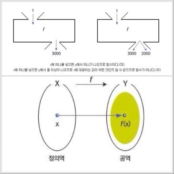 함수는 아래 1,2번 그림과 같이 어떠한 값이 무언가 작용(function)을 하는 함(函) 안을 통과하면 새로운 값으로 나온다는 개념이다. 초등학교적부터 일본의 관수개념으로 많이 접해 보았다. 보다 고차원적인 함수나 초월적 함수의 개념에서는 그 의미가 복잡해지겠지만, 기본적으로 함수는 1:1 대응을 원칙으로 한다. 쉽게 설명하자면, '사다리 타기' 게임과 같다고 할 수 있다. 결국 사다리의 출발점에 따라 그 결과의 값은 고유하다는 것이다.. 물론 같은 값을 가진 시작점이 있을 수 있으나,, 그 값은 결국 상수로서는 같지만 '고유하다는 것'이다.