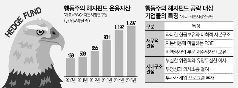행동주의 헤지펀드는 펀드 운용의 목적이 경영권 확보 및 지분구조 재편에 있고, 그로 인한 막대한 수익을 기대하는 공격적 자본을 말합니다. 보통 특정 기업 지분을 매입한 뒤 배당을 확대하거나, 더 나아가 자사주 매입, 인수합병(M&A), 재무구조 개선, 지배구조 개편 등 주주가치를 높이는 것을 적극적으로 요구, 압박해서 주식 가치를 끌어올리는 헤지펀드입니다. 지난한 소송이나 막장식의 주총 표 대결도 마다하지 않습니다.
