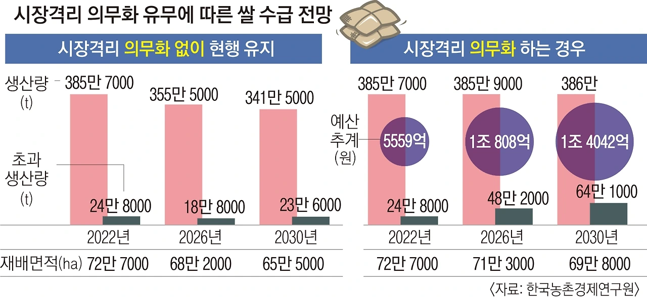 쌀 시장격리 의무화는 쌀 농가에게 안정적인 판로를 보장을 보장하기 때문에, 쌀 소비 감소에도 불구하고 쌀 생산을 유지하거나 늘릴 강력한 동기를 부여한다. 지금도 평년 수준의 작황이면 20만 톤의 쌀이 초과로 공급되는데, 쌀의 공급과잉이 심화되고 오히려 쌀값은 하락할 수밖에 없다. 한국농촌경제연구원에 따르면 시장격리를 의무화하면 2030년에는 쌀 초과생산량이 63만 톤 수준으로 늘고, 쌀이 남아도는 상황에서 쌀값은 오히려 하락하여 최근 5개년 평균 쌀값보다 10.5% 낮은 17만 원 초반/80kg 수준에서 정체하는 것으로 나타났다. 시장격리에 드는 비용도 연평균 1조 원 이상으로 재정부담이 심화되어 청년농업인, 스마트팜과 같이 미래 농업 발전을 위한 예산을 잠식한다.