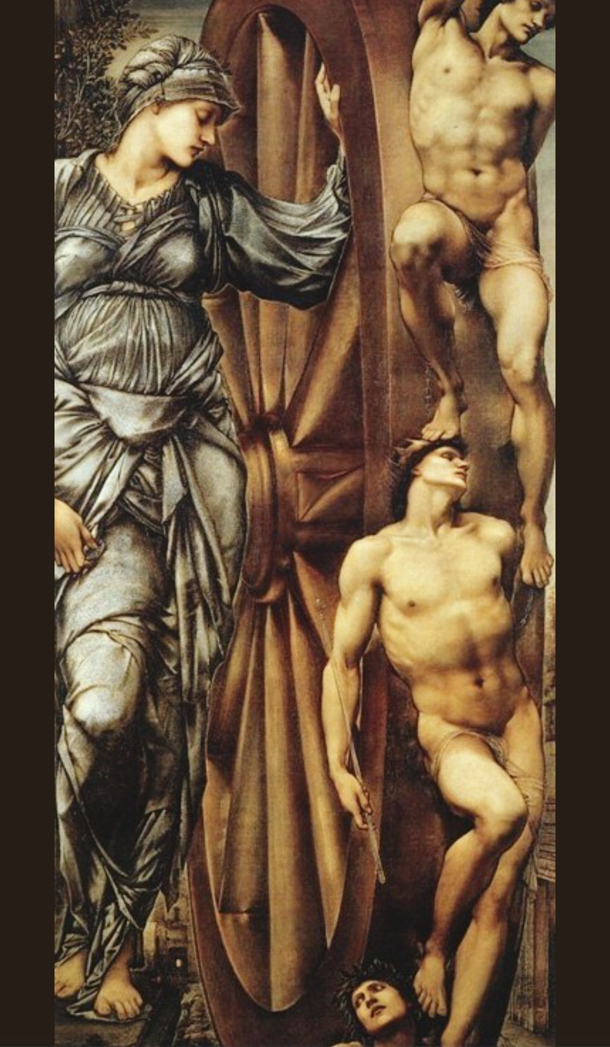 여기에서 언급한 운명의 수레바퀴(Fortune's fickle wheel)는 운명의 여신인 Fortuna가 변덕스러움을 상징하는 수레바퀴를 손에 들고 있는 것에서 유래된 말이라고 합니다. 타로의 10번째 카드인 "운명의 수레바퀴"이기도 합니다.