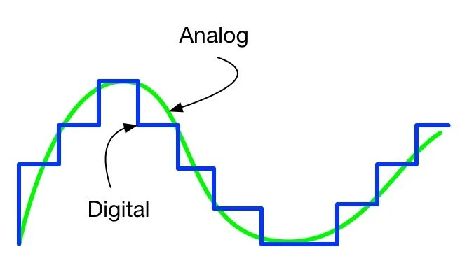 이와 반하여 자동차 엔진 소리의 크기, 컴퓨터를 가동하는 전류의 크기, 전등의 밝기, 엘리베이터의 속도 등은 연속적으로 그 값이 변한다. 이 값을 있는 그대로 다룰 때에는 아날로그 방식이라는 용어를 사용한다. 이 '분절적'인 디지털과 '연속적'인 아날로그의 대칭 의미로의 이해는 대표적이면서 손쉽지만, 이런 이해 방식이 '오해'와 '몰이해'의 시작점이 되기도 한다.