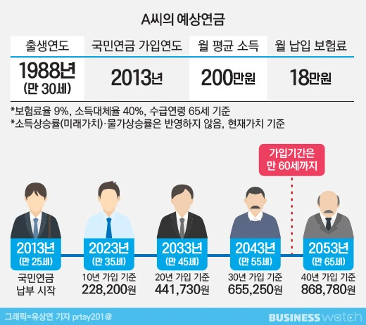 대한민국은 40년 만기 납부한 수급자가 2028년에나 발생한다. 지금 상태라면 2028년부터 40년 만기 납부자가 연금을 청구하기 시작하면 20~30년도 버티지 못하고 고갈될 위기에 있다. 갑자기 셰일가스가 발견되거나, 우주 혜성의 자원이 뚝 떨어지지 않는 한, 40년 만기 납부자가 나오기 전에 보험료를 올려 세대 간 형평성을 제고해야 한다.