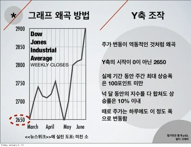 연재 마지막에 더 기술할 예정이지만, 거짓을 이겨내는 "진실의 눈"을 만들어 내야 한다. 우선 한 가지 예로, 『새빨간 거짓말, 통계』의 저자 대럴 허프에 따르면 그래프의 특정 부분에 현혹되지 않기 위한 고의적 "의심"이 있다.