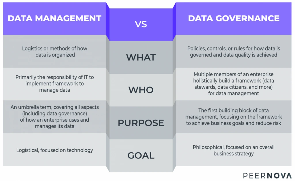 이렇듯, 여기에서 주목할 점은 거버넌스가 "매니지먼트(Management)"와 혼동되거나 혼용되어서는 안 된다는 점이다. 이는 하위 개념인 "데이터 거버넌스"와 "데이터 매니지먼트"와 정확히 구분해야 하는 이유가 된다. 쉽게 말해 거버넌스는 "규범과 통제"의 옷을 입은 관리(Management) 방법론이라고 할 수 있다.