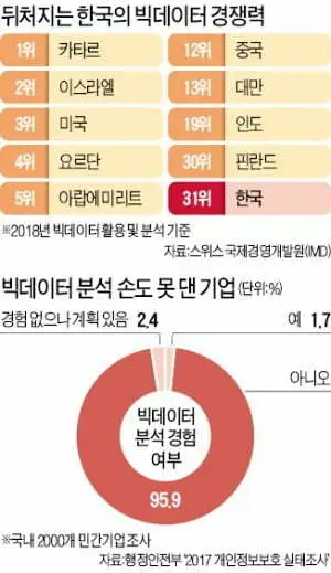 사실 개인적으로 "IT강국"이라는 표현에 쓴웃음이 나온다. 삼성, 하이닉스로 대표되는 메모리 반도체와 LG, 삼성의 디스플레이와 가전제품 때문에 인식의 왜곡이 생기고, 통신사의 호구가 된 전 국민 "보급률" 환상으로 통신 인프라와 스마트폰에 눈을 가리게 되었다. 우리가 인지하는 자랑스러운 이러한 것들은 엄밀한 의미에서 "IT(Information Technology, Intelligence Technology) 산업"이 아니다. 이는 산업 분류로 전기전자장치 제조업, 통신서비스업이다. 흔하디 흔한 게인 노트북과 스마트폰, 그리고 통신 AP, 라우터, 와이파이 기기의 "핵심기술"인 메인 운영체계와 운영 소프트웨어, 중심 제어 비메모리 반도체는 대한민국이 보유한 기술이 아니다. 이런 착시와 왜곡의 세뇌가 "기술 기반 시장에서의 도태"의 큰 작용이었을지도 모른다. 이런 연장선에서 대한민국의 "빅데이터 기술 역량"은 참담하다.