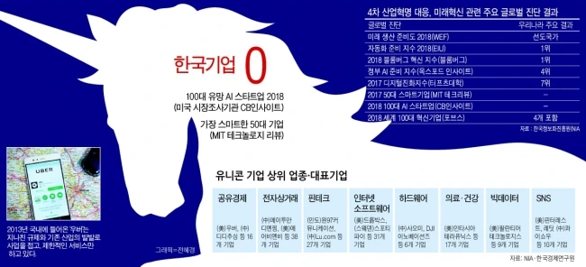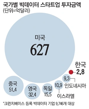 국내 데이터 전문 기업 중 유니콘 기업(기업 가치 1조 원 이상)은 없다. 유니콘 기업은 주로 O2O 비즈니스 모델의 기업이나 게임 업체다. 즉 전자상거래나 화장품, 핀테크, 바이오 분야에서 "데이터"나 "디지털"의 기술 기반이 없는 "비즈니스 모델" 기업이 전부다. 반면, 미국 실리콘밸리에서 탄생한 유니콘 기업의 업종은 다양하다. 인공지능(AI)과 데이터 전문기업도 유니콘 기업 리스트에 이름을 올린다. ‘스노우플레이크'와 ‘데이터브릭스' 등이 대표적인 예가 된다. 한국 기술기반의 AI·데이터 전문기업의 규모가 작은고 영세산 것과 대비된다.