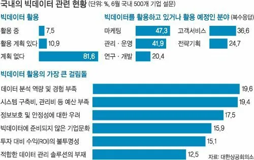 또 "국내에 데이터 전문 유니콘 기업이 없는 이유는 공공 위주로 시장이 형성이 됐기 때문이다"며 "시장을 활성화하기 위해서는 대기업을 넘어 중견기업들도 빅데이터 플랫폼을 사용할 정도는 돼야 기업들이 성장할 텐데, 아직 그 정도 수준까지 가지 못했다"라고 말한다. "데이터를 많이 보유한 기업들은 외부 업체에 분석 등을 맡기기보다는 보통 자체 빅데이터 팀을 만들어 해결하고자 한다"라고 말하기도 한다. 전혀 실정을 모르는 진단이다. 기업은 늘 일반 소비자 시장보다 한 발 앞서 간다. 문제는 "솔루션"이라 할 수 있는 소프트웨어와 개발 서비스가 국산이 없다. 이미 외산 솔루션으로 시장은 무르익었다.
