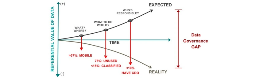 데이터로 인해 얻을 수 있는 효과와 실제 얻고 있는 효과의 차이를 데이터 거버넌스 갭이라고 한다. 거버넌스 갭은 세 가지 유형으로 발생한다. (출처: Hitachi Vantara)