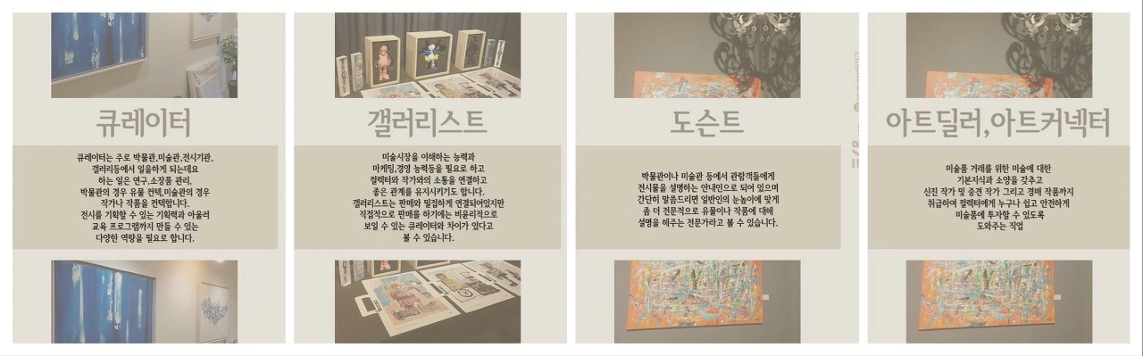 큐레이터는 박물관, 전시관뿐만 아니라 다양한 분야에서도 차용하고 있는데, 단순히 작품을 콜렉팅 하여 보관 관리하는 것뿐 아니라, 전시 콘텐츠 기획, 교육 프로그램 개발, 전시자료 조사 및 수집, 전시설계 및 공사 관리, 감독, 그리고 작가와의 관계 관리까지, 기획사의 총괄 프로듀서, 광고 회사의 AE의 역할을 한다고 한다. 원래는 상업적인 거래를 하지 않는 것이 원칙이어서, 거래를 도모하는 상업 갤러리나 기획사에서 일하는 사람은 딜러, 갤러리스트로 구별하여 부르는 보수적인 견해도 있다. 갤러리, 화랑에는 원칙적으로는 '큐레이터'가 없다고 말하는 이유이기도 하다.