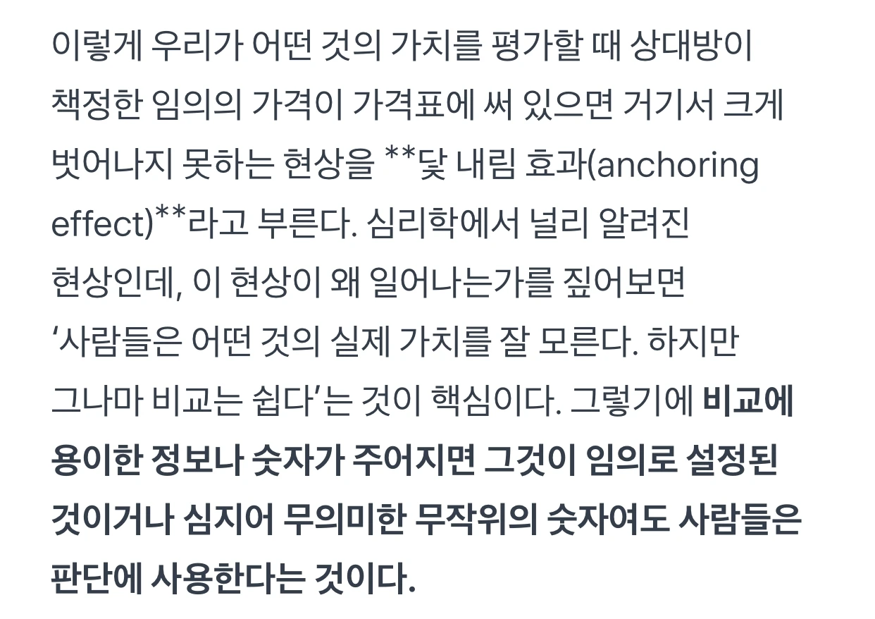 생각보다 흔한 이론이다. 좋은 협상가가 되기 위해서는 상대방에게 요구할 것을 우선 정리하지 않고, 내가 내어 있는 한계를 정리해야 한다. 그것이 '앵커링 이팩트' 효능이 된다. 영리한 소비자가 되기 위해서는 제시하는 가격에 흔들리면 안 된다는 것이다. 자신의 기준에서 채정해 놓은 '최적 가격'을 먼저 구성해야 하는 이유이기도 하다. 그러나 사람의 심리라는 것은 내려진 닻처럼 이미 인지되어 버린 가치가 기정사실처럼 각인되고 만다. 어떠한 경우이든 협상에서 가격표를 먼저 뒤집는 일만큼 어리석은 일은 없다.
