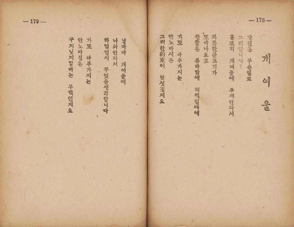 한국의 서정시를 대표하는 김소월의 시는 노래로 제법 많이 만들어졌다. 한때 시험문제에 늘 등장하던 <진달래꽃>은 여러 가수가 여러 버전으로 소개되었고, 시 해석에 다른 토를 달지 못할 것 같은 <부모>도 어르신들에게 잘 알려진 노래다. 그 밖에 송골매의 전신인 활주로가 가요제에서 입상한 <세상모르고 살았노라>도 김소월의 시다. 요즘 세대까지 아우르는 노래가 <개여울>이지 않을까 싶다. 아이유가 영화 음악 작곡가 정재일과 작업한 <개여울>이 많이 알려졌고, 최백호, 심수봉, 우순실부터 김종국, 적우, 웅산까지 많은 가수에 의해 리메이크되었다. 그중에서 정미조의 노래가 가장 좋다.