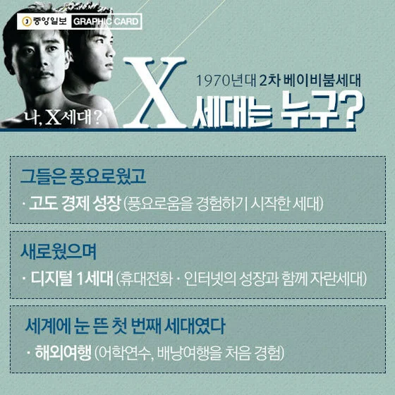 X세대란, 1991년 미국에서 출간된, 캐나다 작가 더글러스 코플랜드가 발표한 소설 『X 세대 Generation X』에서 유래된 용어다. 수학에서 미지수로 대변되는 ‘X’에 대한 의미확장으로 지칭된 세대다. 코플랜드는 자신의 소설 속에서 기성세대의 시각으로는 도저히 이해할 수 없는 자유분방한 행동을 벌이는 연령층의 젊은이들을 통칭하는 단어로 사용했다. 광고회사 제일기획이 작성한 트렌드 리포트는 X세대를 다음과 같이 정의하고 있었다.