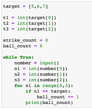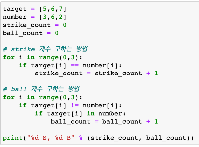 2. Strike와 ball 값 구하는 for문 2개는 for문 하나로 합치면서, if / elif / else 로 아웃까지 해결 가능함