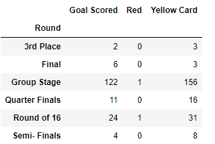 pd.pivot_table(data, index='Round', values=['Goal Scored','Yellow Card','Red'], aggfunc=np.sum)