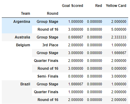pd.pivot_table(data2, index=['Team','Round'], values=['Goal Scored','Yellow Card','Red'])