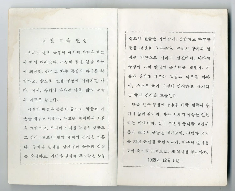 우리는 민족중흥의 역사적 사명을 띠고 이 땅에 태어났다. 조상의 빛난 얼을 오늘에 되살려 안으로 자주독립의 자세를 확립하고 밖으로 인류 공영에 이바지할 때다. 이에 우리의 나아갈 바를 밝혀 교육의 지표로 삼는다…(중략)… 반공 민주정신에 투철한 애국 애족이 우리의 삶의 길이며 자유 세계의 이상을 실현하는 기반이다. 길이 후손에 물려줄 영광된 통일 조국의 앞날을 내다보며 신념과 긍지를 지닌 근면한 국민으로서 민족의 슬기를 모아 줄기찬 노력으로 새 역사를 창조하자. - 1968.12.5 대통령 박정희
