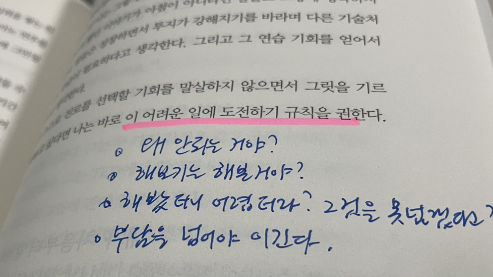 저는 그릿이라는 이 책을 읽으면서 교회에서 배운 것들이 그대로 적용되는 것을 느꼈습니다. 바로 부담을 넘는 법입니다. 이 책에서도 역경을 낙관적으로 해석하면서 고정형 사고방식이 아닌 성장형 사고방식을 말하고 있습니다. 우리는 부담을 만나면 회피하려는 경향이 있습니다. 한번 회피하게 되면 반복하게 되고 절대로 또 다가오는 부담을 넘지 못합니다. 말씀에는 ‘아무것도 염려하지 말라’고 했는데 형편을 보면 눈앞이 캄캄해서 많은 사람들이 정면 돌파하지 못하고 시작도 하기 전에 포기합니다. 형편은 한자로 ‘모양 형(形)’자와 ‘편할 편(便)’자로 이루어져 있습니다. 그런데 재미있는 것은 이 ‘편할 편(便)’자가 ‘똥오줌 변(便)’자로도 쓰인다는 것이죠. 즉, 눈앞에 다가온 어려운 형편을 이른바 하찮은 ‘배설물’로 여기라는 것입니다.