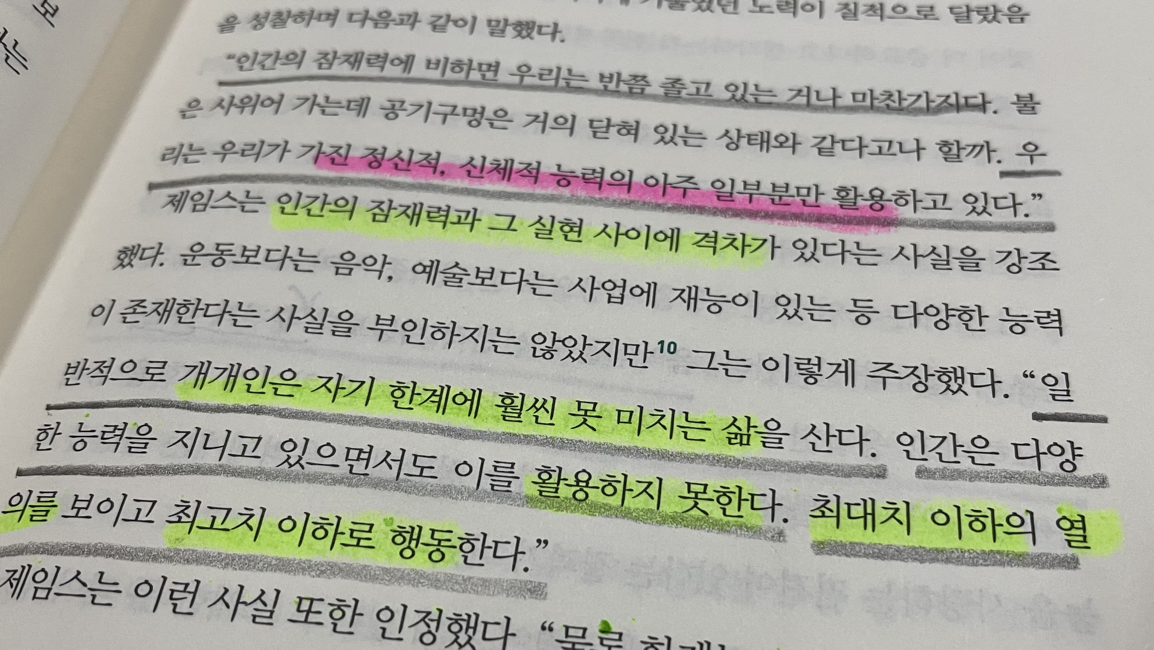 “인간의 잠재력에 비하면 우리는 반쯤 졸고 있는 거나 마찬가지다. 불은 사위어 가는데 공기구멍은 거의 닫혀 있는 상태라고나 할까. 우리는 우리가 가진 정신적, 신체적 능력의 아주 일부분만 활용하고 있다. 일반적으로 개개인은 자기 한계에 훨씬 못 미치는 삶을 산다. 인간은 다양한 능력을 지니고 있으면서도 이를 활용하지 못한다. 최대치 이하의 열의를 보이고 최고치 이하로 행동한다.” (p.047)