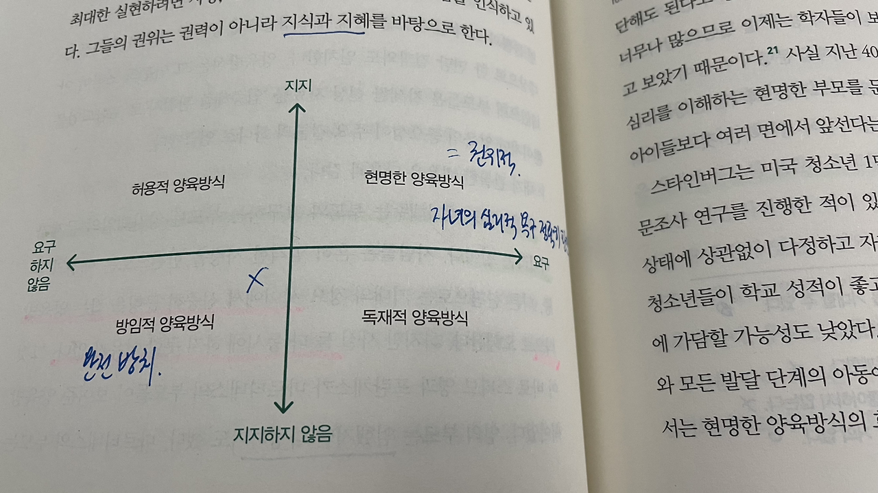 이 책에서도 여러 사례를 들어 그것을 이야기하고 있습니다. 시련에 대한 훈련은 부모가 아이들을 전폭적으로 사랑해서 하는 아픈 훈련입니다. 그것을 여기에서는 위 그림 1 사분면에 있는 ‘권위적인 양육방식’이라 이름하고 그것을 ‘현명한 양육방식’이라고 부르고 있습니다. 즉, 지지를 전폭적으로 해주지만 방임하지 않고 끊임없이 요구를 하는 부모의 역할을 말합니다. 자녀들은 한편 부모의 간섭이 크다고 말할 수도 있습니다. 따라서 조화가 필요합니다. 그런데 그 ‘권위적’인 뜻에는 부모의 ‘이기적’인 것이 포함되어 있으면 안 됩니다. 대학 신입생이 전과가 잦은 것도 사실은 부모의 이기심에서 발현된 잘못된 현상입니다.