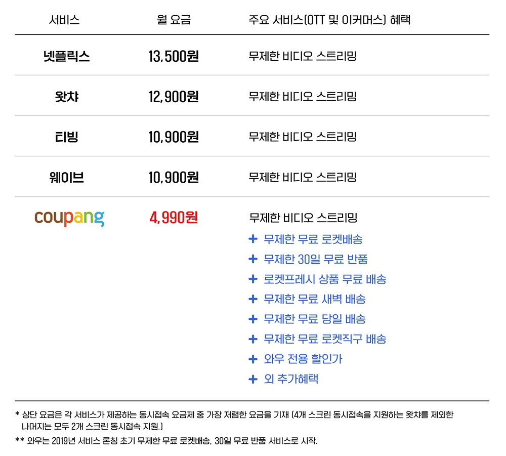 쿠팡(Coupang)의 와우 멤버십은 로켓배송, 쿠팡플레이(OTT), 쿠팡이츠 할인 혜택을 월 4,990원에 모두 제공하는 구독 번들링 전략을 사용합니다.