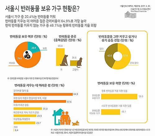 문화체육관광부와 농촌진흥청에서 공동으로 실시한 '2018 반려동물 보유 현황 및 국민 인식 조사'를 살펴보면 반려동물 월평균 양육비는 14만 5천 원이다. 한 편 반려동물을 키우는 서울시민 중 그만 키우거나 버리고 싶은 충동을 느낀 경우가 40%였는데, 가장 어렵다고 느낀 점은 '관리비용이 많음'이었다. 2014년 이후 년간 유기되는 반려동물은 꾸준히 증가하고 있고 2017년 유기된 동물은 약 10만 마리다.