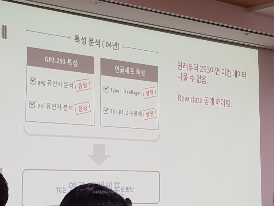 이번 사태의 시작은 15년 전으로 거슬러 올라간다. 코오롱은 2004년 TC의 특성을 분석해 식약처로부터 승인을 받을 당시 연골세포의 특성을 인정받았다. 이후 전임상과 임상 등의 단계를 거쳐 2017년부터 국내 판매에 들어갔고 현재 미국에서 임상 3상이 진행 중이다. 하지만 올해 들어 최신 유전자 검사기법 가운데 하나인 STR검사법을 진행한 결과 연골세포가 아닌 293유래세포의 성분이 나타났다는 게 코오롱 측의 설명이다. 문제는 연골세포가 아닌 293유래세포의 성분이 나타난 원인에 대해 코오롱에서 어떤 해명도 못하고 있다는 점이다. 이 대표는 “너무 오래전의 일이라 객관적으로 입증 가능한 부분이 많지 않고 현재 조사를 하고 있다”며 “실수인지 다른 이유가 있어서 그런 것인지 단정적으로 말하기 어렵다”고 밝혔다.