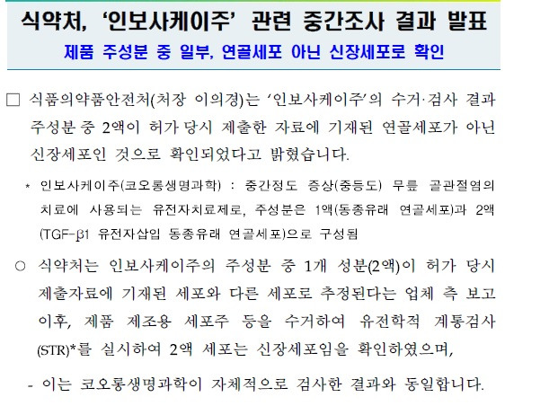 사태가 공론화된지 2주 뒤인 4월 15일 식약처의 조사 결과가 나왔다. 국내에 유통되는 인보사의 형질전환세포(TC)가 미국 검사 결과와 동일한 신장세포(293유래세포)임을 확인한 것이다. 식약처는 5월까지 코오롱생명과학의 자회사 코오롱티슈진의 미국 법인에 대한 현지실사까지 벌이기로 했다. 식약처 관계자는 “지난 9일 세포·유전자 치료제 분야 전문가 5명으로 구성된 전문가 위원회 개최 결과 이 같은 사실을 확인했다”며 “허가 당시 코오롱생명과학이 제출한 자료는 연골세포로 판단되지만 현재 시판 중인 2액의 주성분이 293세포로 바뀐 경위 및 이유에 대해 추가로 조사를 시행할 계획”이라고 말했다.