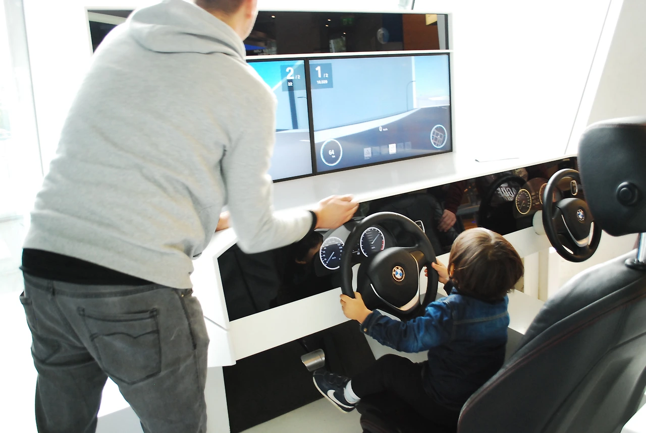 시뮬레이션 게임. 엑셀과 브레이크에 발이 닿지 않은 카안은 아빠의 도움이 필요했다.