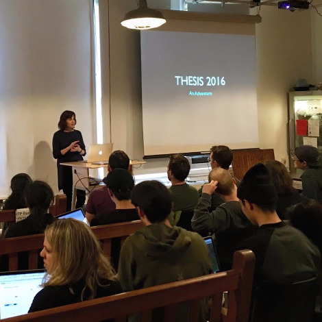 학기가 시작되기 전에, 미리 관심분야에 대해서 학생들에게 survey를 해서, thesis 관심사별로 그룹을 나누었다. 그 결과 대략 12개로 나누었고, 그룹 1개당 7~9명이 배정되고, 그룹 2개당 1명의 Thesis Advisor와 2명의 Resident (연구학생)이 따라 붙는다. 학기 초반에는 컨셉 공유 및 계획들에 대해서 상의를 하고, 중반에는 관련 자료들의 리서치, 여러가지 experomental test들을 하면서 시행착오를 거치면서 학기 막판까지 User test를 하면서 유용하게 쓰일 data들을 수집한다. 마무리 단계에서는 결과물들을 최종 발표때 사용할 만큼의 퀄리티를 올리게되고 동시에 발표준비를 한다. 이 모든 과정들을 혼자하지만, Advisor, resident 및 주변의 친구들에게 많은 도움을 받을 수 있으므로 본인의 프로젝트를 확장시켜 나갈 수 있다. 내 경우에는 아무래도 프로그래밍 부분이 조금 약해서 시간이 오래 걸리는데, 막히는 부분들은 코딩에 능숙한 애들을 통해서 많은 도움을 받았다. 반대로 나 역시 디자인 관련한 조언이 필요한 친구들에게 최대한 많은 도움을 주려고 노력하였다.