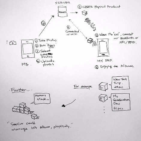 내 프로젝트는 스마트폰 사용에 능숙하지 못한 시니어(노인들)들을 위한 사진 공유 플랫폼을 만드는 것이었다. 손에 쥘 수 있는 physical product를 통해서 좀 더 쉬운 사용성을 제공하고, 동시에 복잡해보이는 스마트폰 사용으로부터 시니어들을 자유롭게 해준다는 컨셉이었다.