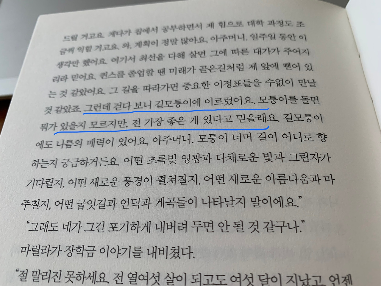 “그런데 걷다 보니 길모퉁이에 이르렀어요. 모퉁이를 돌면 뭐가 있을지 모르지만, 전 가장 좋은 게 있다고 믿을래요”