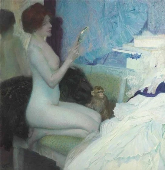 Leopold Museum에서 트램으로 오분만 가면 벨베데르 궁이 있고 거기엔 구스타프 클림트의 그 유명한 키스가 전시되어 있다. 그 그림을 보기 위해 전 세계에서 모여든다. 그 바로 옆방은 비슷한 시기의 오스트리아 작가들의 그림이 전시되어 있는데 이곳에선 그림을 보기 위해 머무는 사람은 별로 없다. 바로 거기 내 눈에 띄는 작품이 하나 걸려 있다. 어디서 많이 본 여인의 모습…? 분명 어디서 많이 보았는데.. 누구지.. 하다가 그 얼굴에 찍은 점을 보자마자.. 아 그 요망한 것이 여기도!.. 하며 내 발길을 사로잡는다. 그렇다. Otto Friedrich의 작품이고 같은 여인의 모습이다. 이 화폭에선 빨간 옷을 입었을 때처럼 요망해 보이진 않고, 인기 많은 귀부인 모습이다. 여기서도 화풍에 마네의 풍이 느껴진다. 무척이나 반갑다. 아는 만큼 보인다고, 그의 그림에 관심을 두니 숨어 있던 이 그림도 이젠 눈에 들어온다. 이왕 그렇게 된 것, Friedrich에 대해 시간을 투자했다. 그의 모든 그림을 섭렵하고, 배경을 공부하니 찔끔 이 여인에 대한 언급이 나오는데, 정확히 누구인지는 알려지지 않고 있다. 당시 대부분의 예술가들은 조강지처를 두고도 뮤즈를 하나씩 데리고 있었던 터라 그중 한 명 일거라는 개인적인 추측이다.