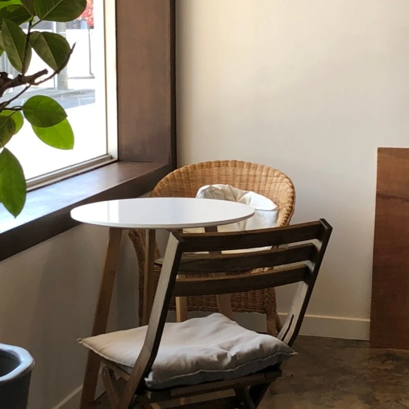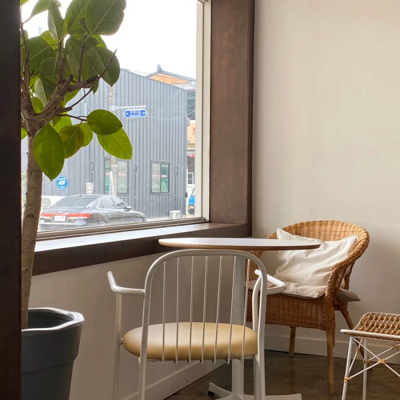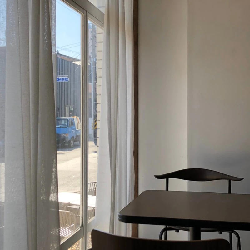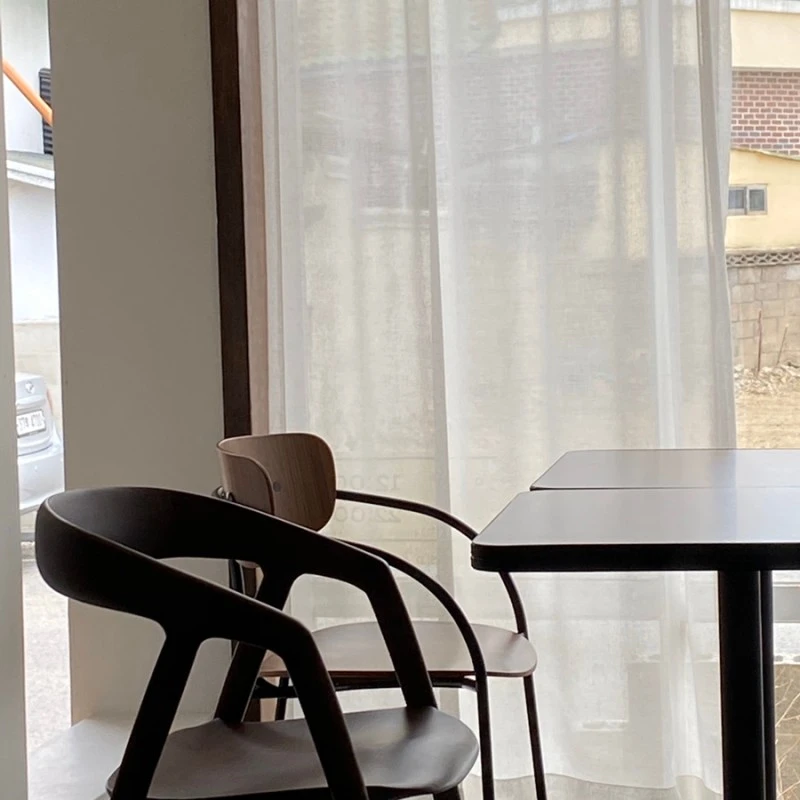 미송이 주는 느낌 중 하나는 ‘저렴함’이라고 생각한다. 물론 미송을 잘 활용하시는 분들도 많고, 실제로 그런 카페도 다수 존재한다. 그래도 내 생각은 톤을 죽여도 미송은 미송이다. 월넛을 따라하려고 해도 따라할 수 없다. 톤 다운된 가구를 배치했다. 톤 다운된 것만으로도 조금 더 무게감 있는 분위기를 표현할 수 있다고 생각했고, 배치하고 나니 더욱 더 그렇게 느껴졌다. 테이블은 월넛 색의 상판과 블랙 철 프레임으로 제작된 것으로 무게감을 표현하기에 적합했다.