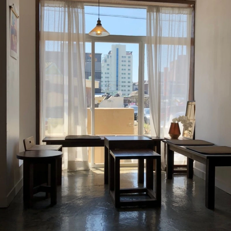 기존 거실 좌석은 단체손님이 올 경우를 대비해서 만들어 놓은 좌석인데, 생각보다 불편해하시고 앉기 자체를 고민하시는 분들이 많으셔서 교체 1순위였다. 지금은 높이 700의 일반 테이블 2개를 배치했다. 의자는 모두 디자인 가구로서 편안함에 중점을 두고 배치했다. 앞으로는 여기서 노트북도 하고 편하게 이용하길 바라는 마음이다.