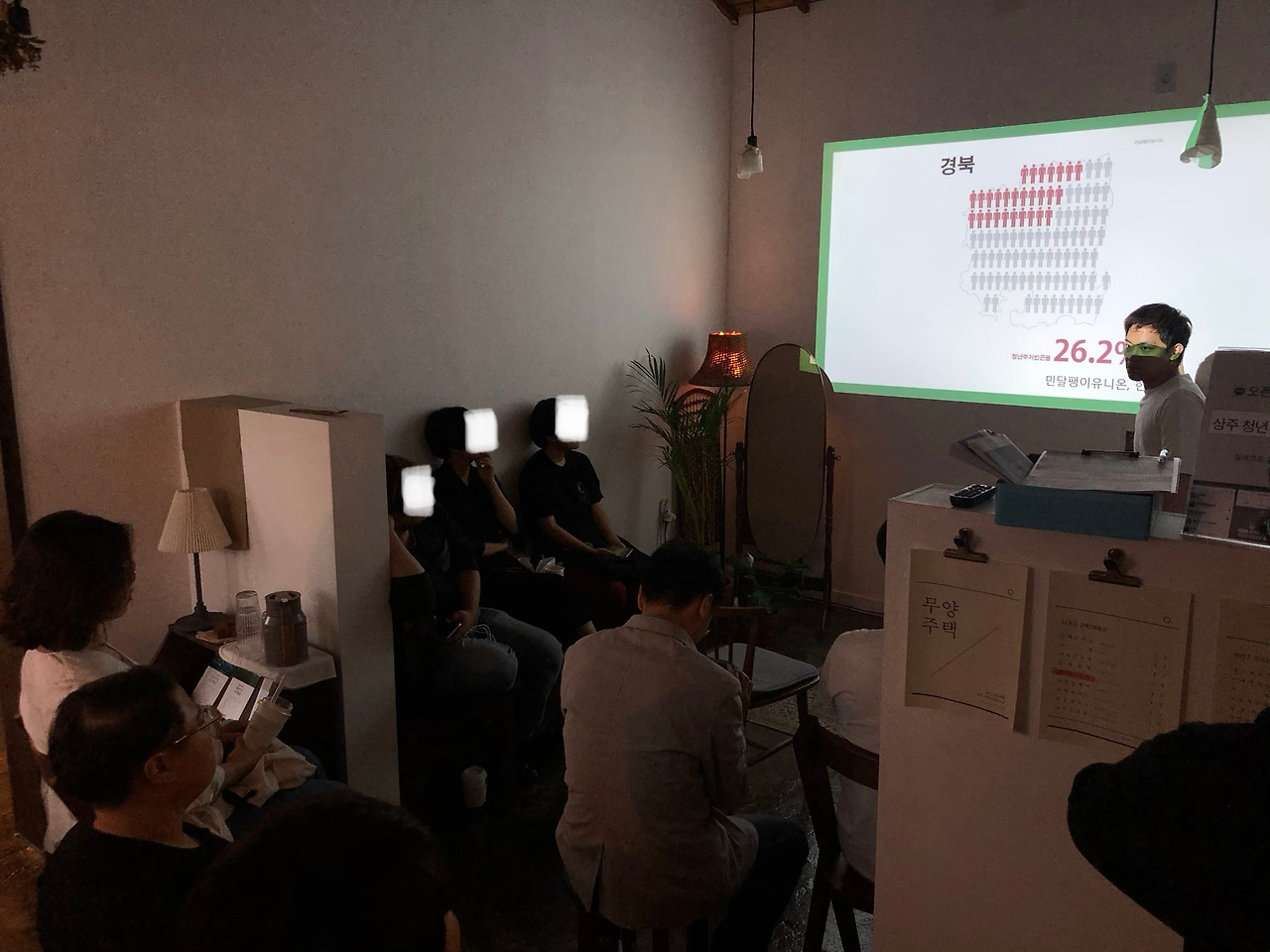 2. 2019년 6월 12일, 민달팽이협동조합에서 청년주거특집 쉐어하우스 라는 주제로 강연이 진행되었다. 약 열여덟 분의 청년과 두 분의 시의원, 상주의 청년단체인 JCI에서 두 분, 집 짓는 목수님께서도 참석해주셨다. 단순히 쉐어하우스가 가지는 의미를 넘어서서 다양한 네트워크가 형성되고 있다는 것을 피력했고, 시의원 두 분께서도 조례 제정에 힘써주신다는 약속을 해주셨다.