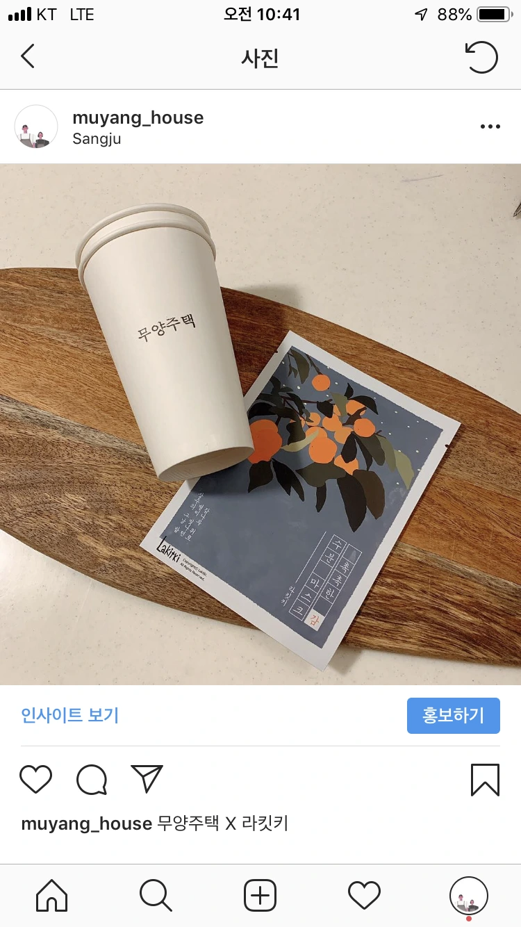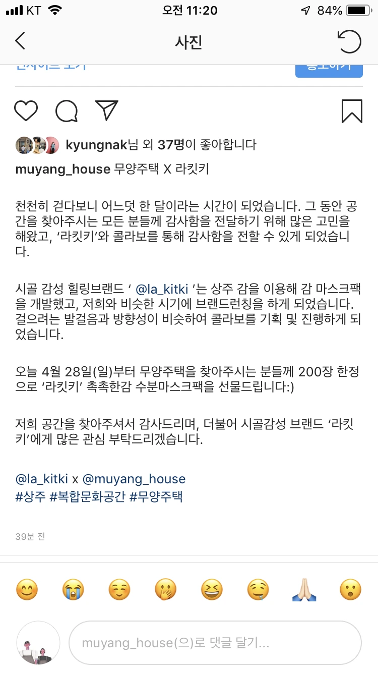 첫 달, 우리는 눈을 뜨면, 출근해서 음료를 만들고 손님을 응대했다. 그렇게 전쟁 같은 하루를 치르고 돌아와 쫓기듯 잠에 들었다. 그렇게 한 달이라는 시간이 흘렀다. 무엇 하나 감히 해볼 정신없이 바쁘게만 흘러간 첫 달이였다. 그래도 아무것도 안하진 않았다. 우리가 바쁘게 지내던 사이에 도시청년시골파견제로 상주에 내려오신 ‘라킷키’의 조우리 대표님 또한 상주 감을 이용하여 감 마스크팩 2종을 출시하셨다. 라킷키의 론칭 기념, 무양주택의 오픈 기념을 동시에 축하하는 의미의 콜라보레이션을 진행했다.