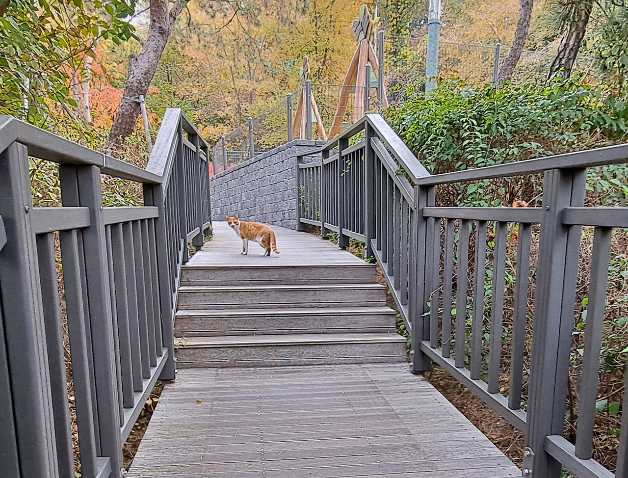 오솔길 나무 계단을 달려가는 고양이 한 마리, 반가움에, 거기 서! ㅡ그랬더니 정말 달음질을 멈추고 나를 돌아본다.